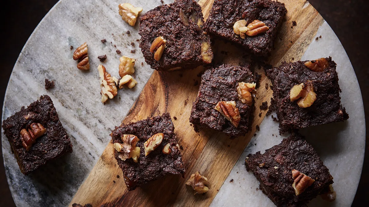 Rich brownie infused with dates and walnuts, served warm with a drizzle of tahini.